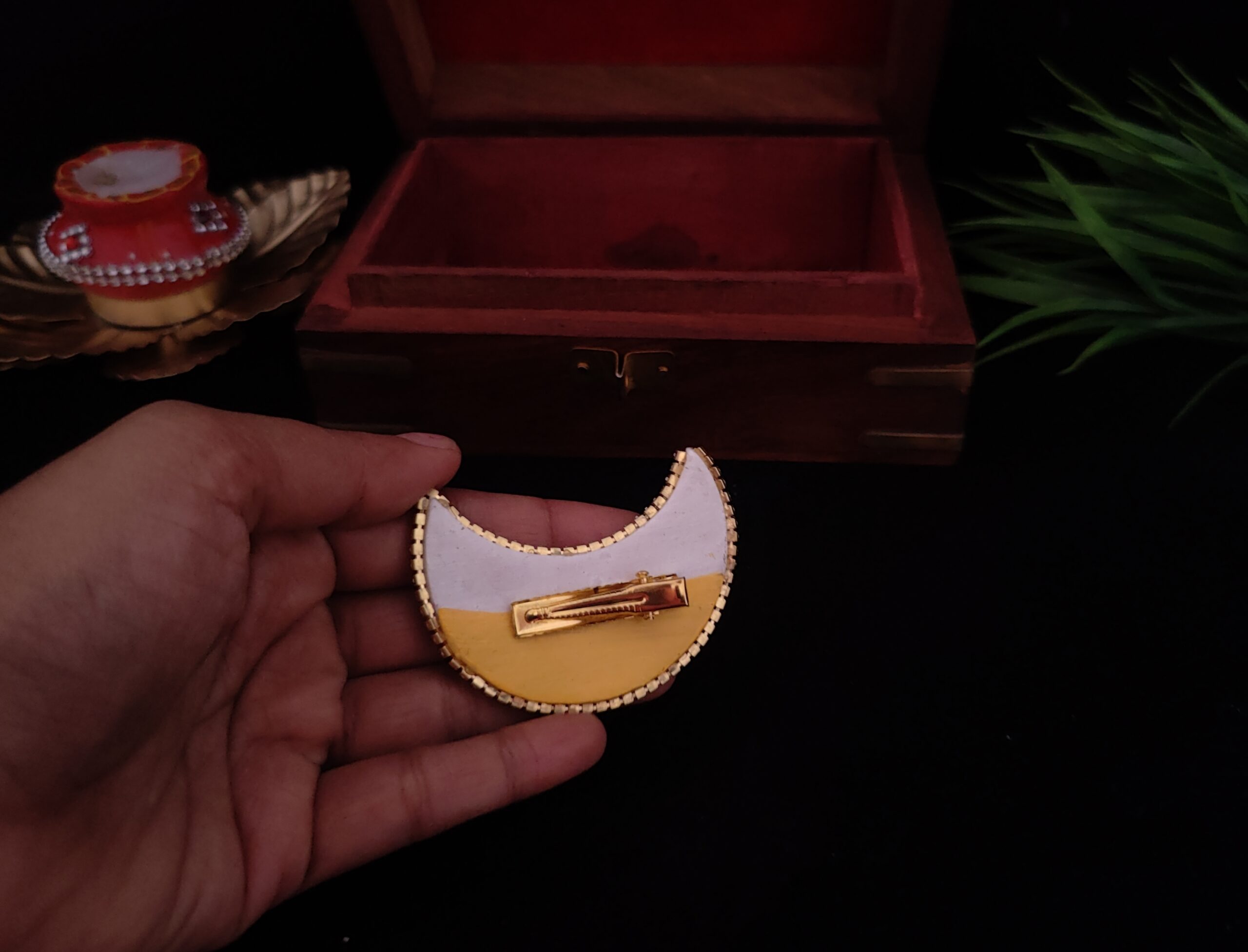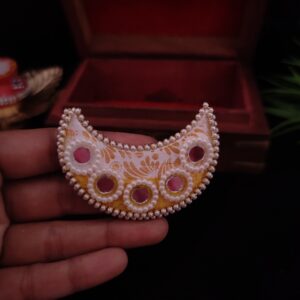 Devana elegant polki stuck maang tikka. It is one circle with polki work in centre, loreals below and pearls around making it look extremely elegant and an head turner piece.